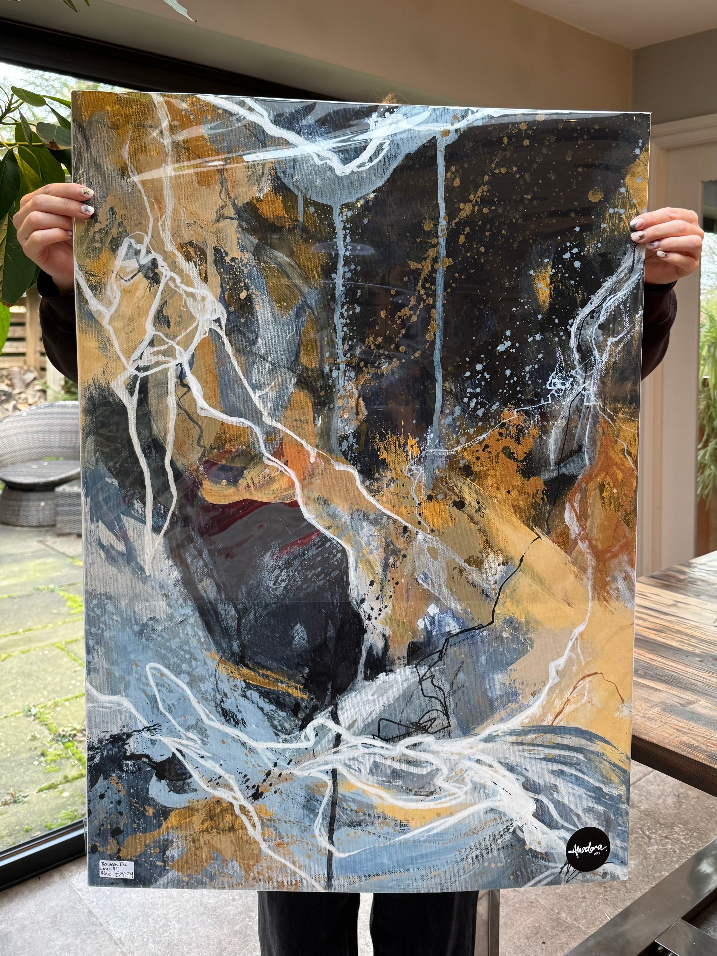 This abstract print explores a striking palette of navy, greys, and silvers, balanced by hints of beige, rich gold, and yellow ochre, while capturing the dynamic brushstrokes and fragmented white lines of the original. ‘Between The Lines’ invites viewers to discover intertwined details within each layer, creating a bold and sophisticated statement for any space.